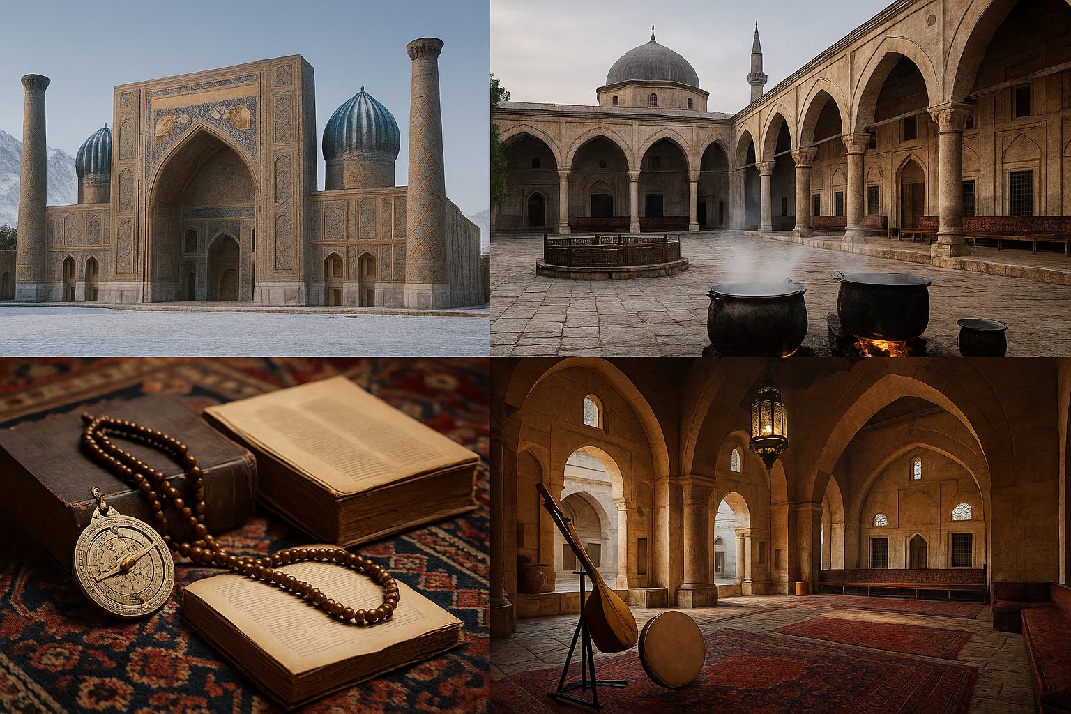 في الشرق وُلد للتصوف مزاجٌ آخر: صبرُ الخلوة تحت ثلج خراسان، وخدمةُ «الخانقاه» بوصفها بيتًا للطريق يُعقد فيه الذكر ويُدرَّس فيه العلم وتُطعَم فيه الضيافة، ثم اتساعُ المدينة في دلهي وقونية حتى صار الذكر جزءًا من صناعة العمران. تبدأ الخيوط مع مدارس خراسان وما وراء النهر؛ هناك ربّى يوسف الهمذاني (ت 535هـ/1140م) رجالًا على الصحبة والمحاسبة، وتأثر به خواجة أحمد يسوي (ت 562هـ/1166م) الذي أنزل الذكر إلى اللسان التركي في أناشيد شعبية، فصار مجلسه مدرسةً تجاور السوق ورباط الثغر، وتغدو القصيدة اليسوية جسرًا بين الدين واللسان والقوم. ومن هذا الجذر خرجت مدرسة بخارى مع بهاء الدين نقشبند (717–791هـ/1318–1389م): نشأ قرب مدينته بين حلقات الفقه وأعمال الحِرف، ثم استوت طريقته على الذكر الخفيّ، وصحبة الشيخ، وإيثار الصحوة على السُكر، وكثرة الخدمة في صمت. ليست النقشبندية تكرارًا لمدارس العراق، بل بناءٌ خراساني عمليّ يردّ الطريق من الاستغراق في الوجد إلى حضور يقظ في العالم. اعتاد مريدوه قراءة القرآن وأورادهم في مواضع العمل والحِرف والتجارة حتى أصبحت عادة عند الكثير من تجار الشام ومصر والسودان والمغرب، حتى حديثا، باستعمال مسجلات الصوت والإذاعة. وجعلوا الخانقاه بيتَ تهذيبٍ وخدمة. وبعد قرون سيصل نفَسهم إلى الأناضول والشام عبر خالد البغدادي (1193–1242هـ/1779–1827م) فيتحول الطريق شبكةً تنظّم حياة المدن لا الأفراد فقط.