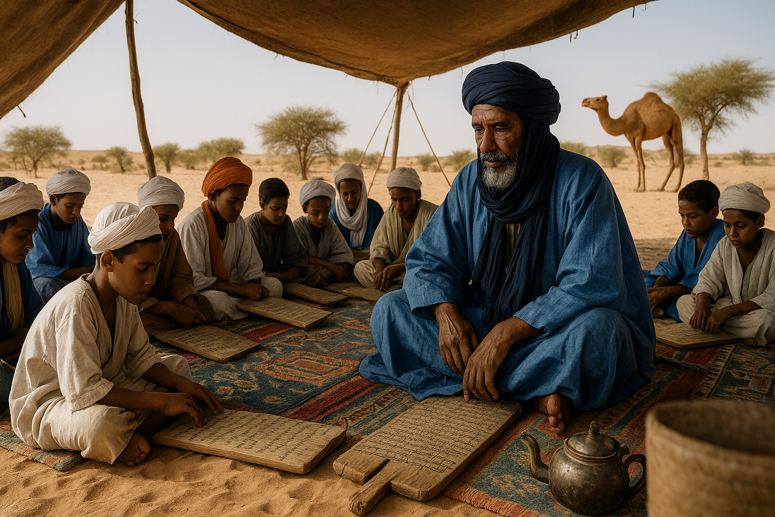 بين شنقيط وتوات وتمبكتو نشأت «المحظرة» مدرسةً تُجالس الزهد: حفظٌ متين للقرآن والفقه واللغة، وتقشّفٌ يُدرّب على الخدمة وضبط النفس. وفي طبقة «الزوايا» العالِمة صار للذكر ظهرُ قافلة: خيمةٌ للورد، ودفترُ وقفٍ صغير يطعم العابرين، ومجلسُ إصلاحٍ بين القبائل. هنا قادت شبكة الكنتي الامتداد القادري عبر الصحراء؛ جمع سيدي المختار الكنتي (ت 1226هـ تقريبًا/1811م) تلامذةً وتُجّارًا وربط مجالس العلم بأسواق توات وتمبكتو، ثم تسللت التيجانية على الأثر بأورادٍ منظمة من فاس جنوبًا حتى النيجر والسنغال، وتجلّى في العهد المتأخر نفَسُ الخدمة والجهاد الروحي عند الشيخ ماء العينين (1247–1328هـ/1831–1910م) الذي أسّس زوايا على طرق القوافل وربطها بالتعليم والإمداد.